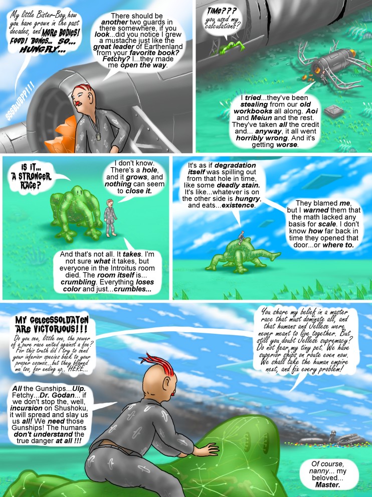 Needless to say, Dr. Godan's ultimate dream, the dream of every Jellese in Pastel, is to be able to find a way to return to the Tryslmaistan cosmos, with all of it's lovely ambient electanic energy, which supports and maintains their unique liquid crystalline biology.