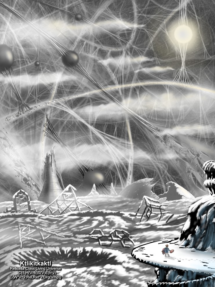The universe of Ktlikitkaktl appears as an incredibly vast network of strings and cables, akin to the fibers within a human heart, only these strands are vast in size and length, and have whole landscapes upon them. The fibers are the ground and ocean and mountain and land of the cosmos. And the great fibers are hung from each other by still more strands, which in turn are supported by finer strands...