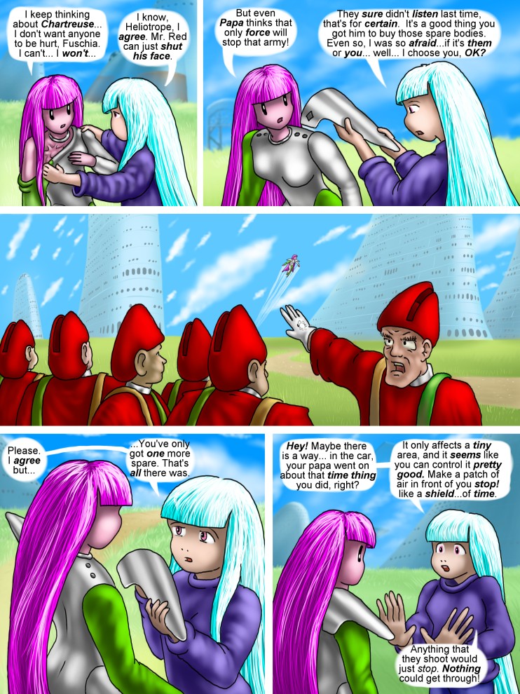 PAGE FOOTNOTES  Some readers have speculated that a better solution would be to use the time stop capability to have Heliotrope run about and take the weapons away from all of the Church Army soldiers, while she was outside of time. The metatemporal field that Heliotrope generated previously to play on the swings with her papa was essentially a spherical bubble about four meters in diameter, centered on the Omnipitor. Anything inside the space of that bubble shares in excluded time, which is why the swings could still be used, and why she could even just manage to walk about through the air at all.