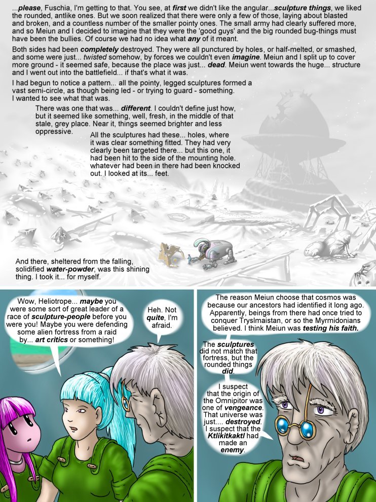 PAGE FOOTNOTES: Finally we get to see how Dr. Aoi found the Omnipitor, and in what location. I think longtime readers of my works will have already guessed the source of the two armies, just from their look.