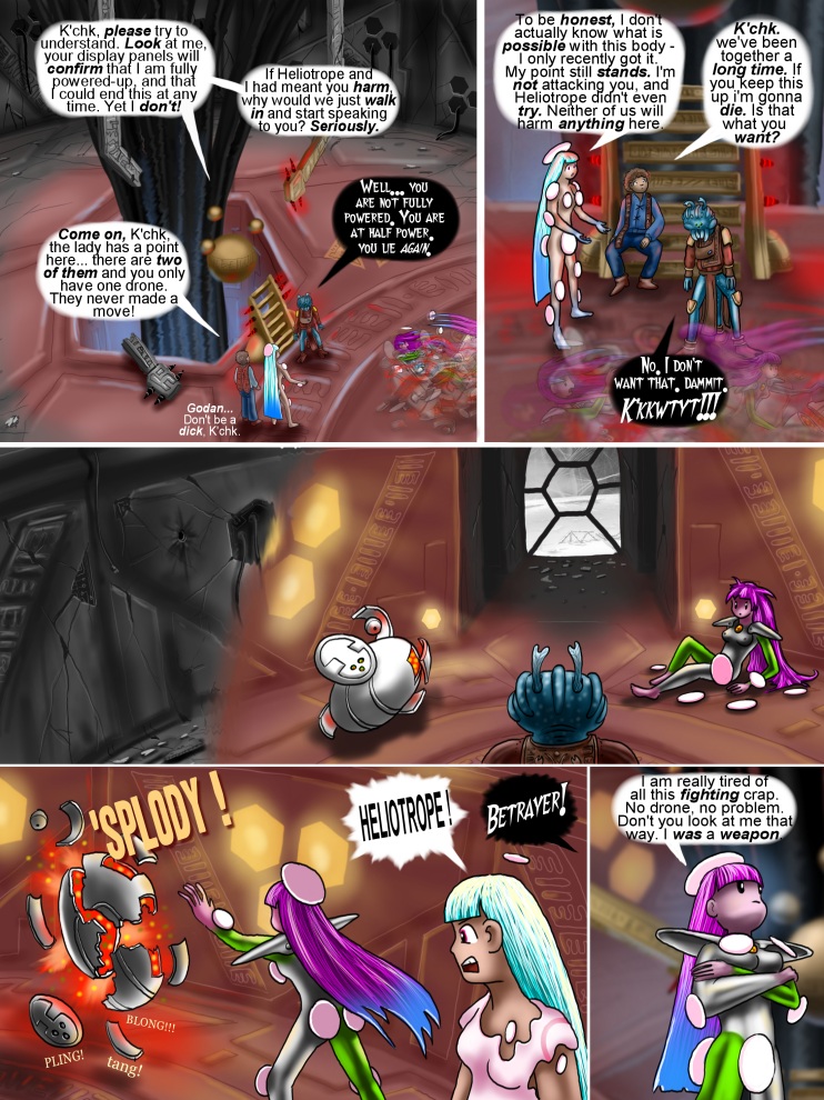 PAGE FOOTNOTES: It looks like Heliotrope has definately gained humanity from all of her time among the primates, and the same may also be true of K'Chk, having spent only Godan knows how many years alone with Meiun (Actually, Godan could not know - in fact, Dr. Godan would have no way to even have a clue about what is happening with Fuschia and Heliotrope... but I digress).