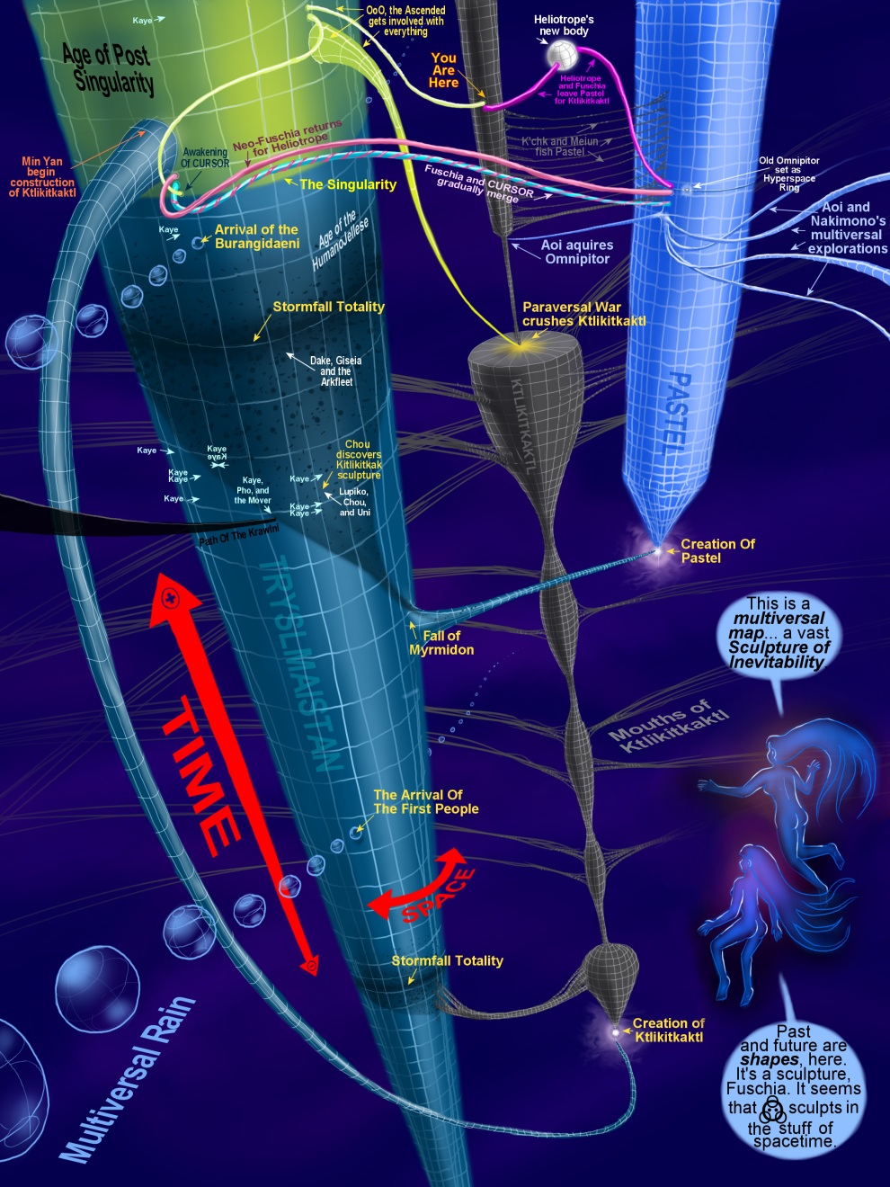 To cure that problem, I popped the basic notion of the Minkowski diagram into another dimension, the third dimension, and made dimensional sculptures represent discreet universes. The shapes of the surfaces they represent define the history, the worldline, of entire cosmologies. And of course, interuniversal travel and contact, as well as multiversal level constructions and artifices, can be represented as tubes, ribbons, and other forms within my diagram.